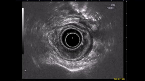 Bei diesem Patienten liegt ein lokal fortgeschrittenes Rektumkarzinom im Stadium uT3 uN+ vor. In der Endosonografie kann man die normale 5-Schichtung des Rektums sehen, die aus den Wandschichten und den sonografischen Grenzflächen besteht. Bei 5-6 Uhr SSL ist eine Raumforderung zu erkennen, die diese Wandschichtung aufhebt. Gut zu sehen ist, wie die äußere echoarme Schicht, die die Serosa repräsentiert, durchbrochen wird.